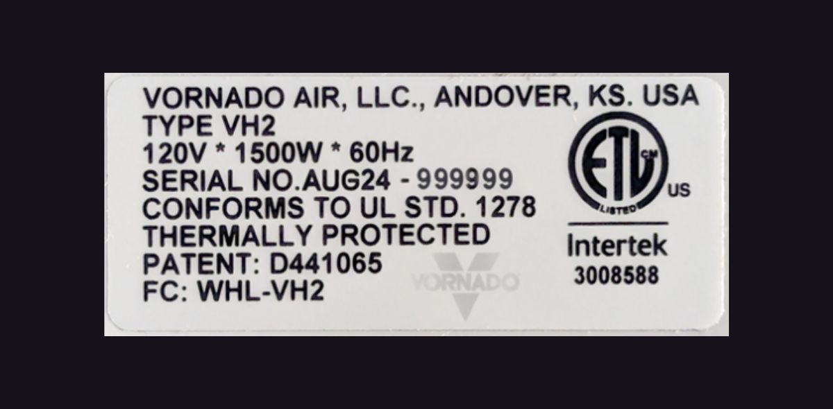 Vornado VH2 Whole Room Heaters are marked with a date code of either “JUL24” or “AUG24” and labeled as “TYPE VH2” on the silver rating label located on the heater’s bottom.
