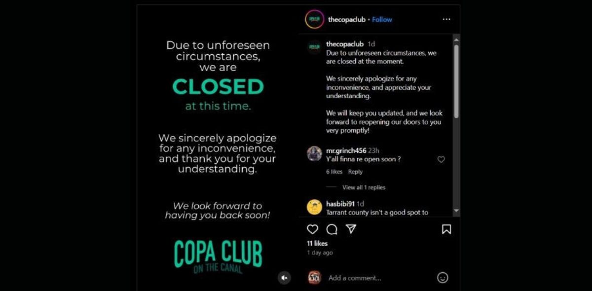 DX went to the Copa Club during its operating hours on February 28. The lights were on inside and outside of the restaurant. However, there did not appear to be anyone inside, and the business did not appear to be open to customers.